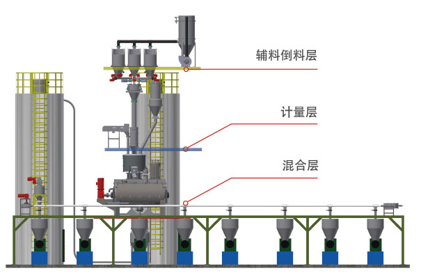 以上簡要介紹了全自動配混料系統的各主要組成部分。在實際生產中,還要考慮如何將這幾大部分有機地結合起來,以構成一個完整的系統,這就涉及到工藝流程的設計問題。