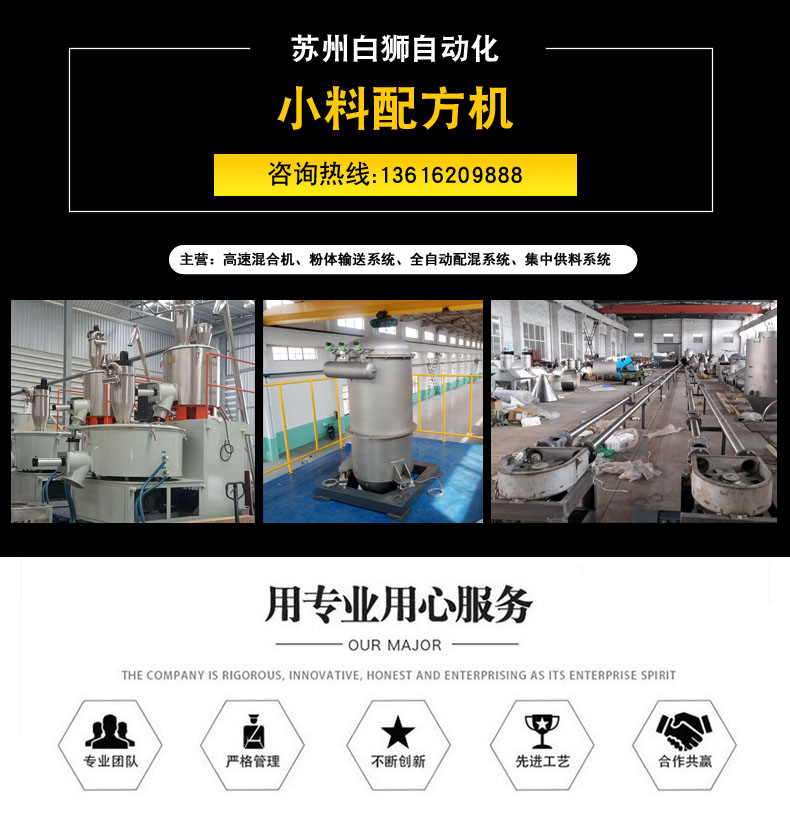 小料配方機用于多種粉、粒狀物料按設定比例進行精確配料。適用于塑料、食品、化工 等行業。典型用于PVC制品行業,為輔料添加劑進行自動精確配料。 高精度輔料配料機——針對塑料行業人工配輔料(如石蠟、穩定劑、硬脂酸、ACR等)麻煩問題,我們開發了該設備,特點如下: