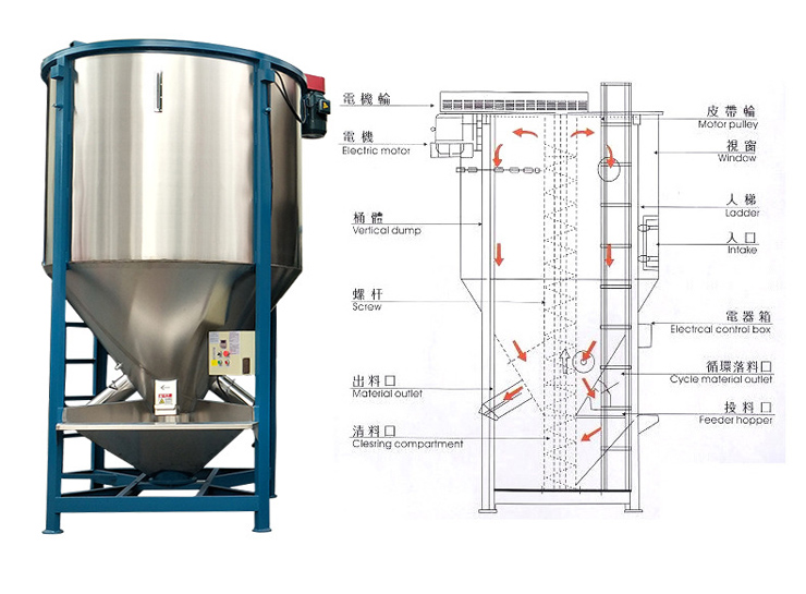 塑料顆粒烘干攪拌機(jī):白獅大型立式混料機(jī),采用螺旋攪拌工作之原理,將投入投料斗中的物料通過螺旋主軸輸送到桶體上端,再以傘狀形落下且一直持續(xù)循環(huán)攪拌,從而達(dá)到混勻的目的。